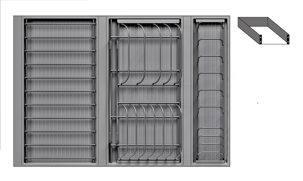 • 1 большой модуль для посуды + 1 малый модуль с решеткой + модуль для столовых приборов