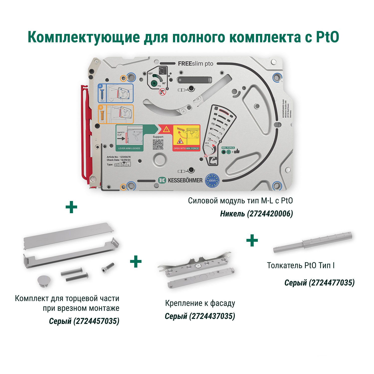 Полный комплект ультратонкого подъемного механизма ФриСлим ФЛАП Kesseböhmer c толкателем PTO тип II для врезного монтажа, цвет СЕРЫЙ